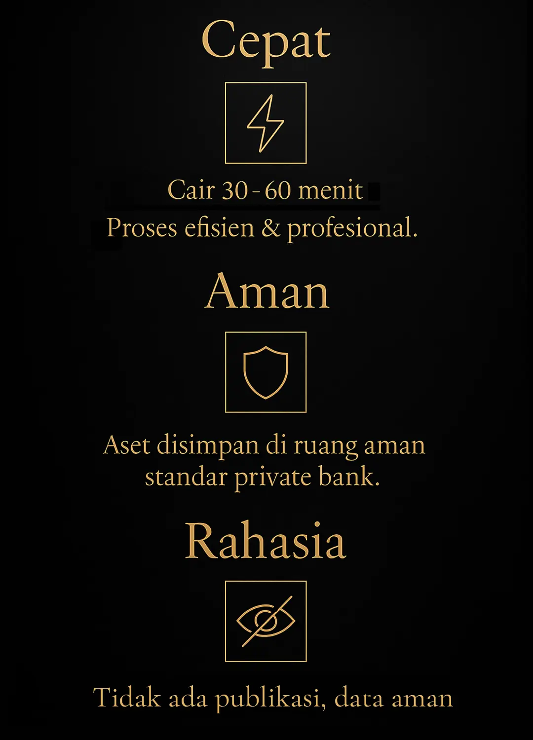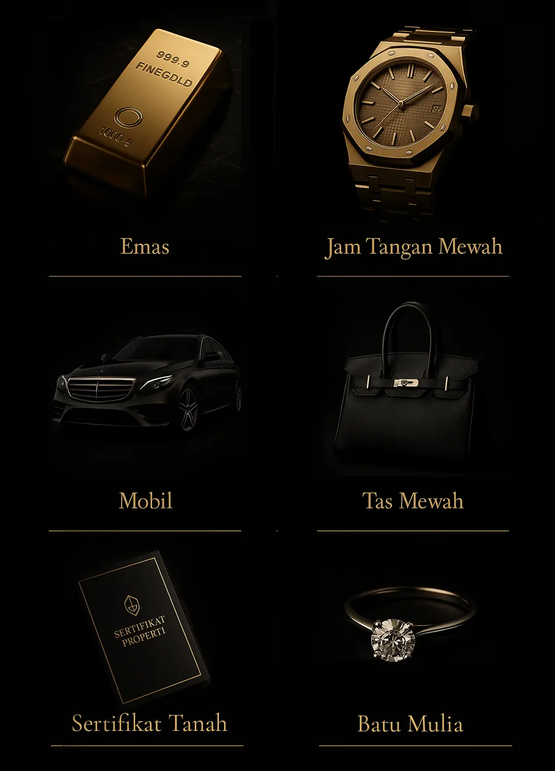 Setiap klien memiliki kebutuhan berbeda. Karena itu, kami memberikan skema pinjaman yang fleksibel, nilai taksiran yang adil, serta proses yang transparan tanpa biaya tersembunyi. Aset Anda kami nilai secara profesional dan disimpan dengan standar keamanan tinggi selama masa pinjaman.