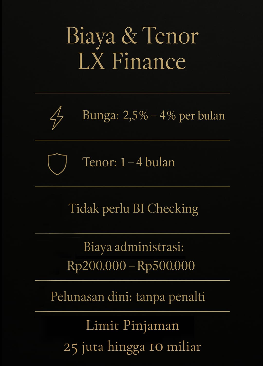 Seluruh proses berlangsung secara privat melalui pertemuan khusus atau concierge visit sesuai permintaan. Tanpa antrean, tanpa eksposur publik, tanpa risiko data bocor. Dengan LX Finance, Anda mendapatkan likuiditas cepat tanpa kehilangan kendali atas aset Anda.